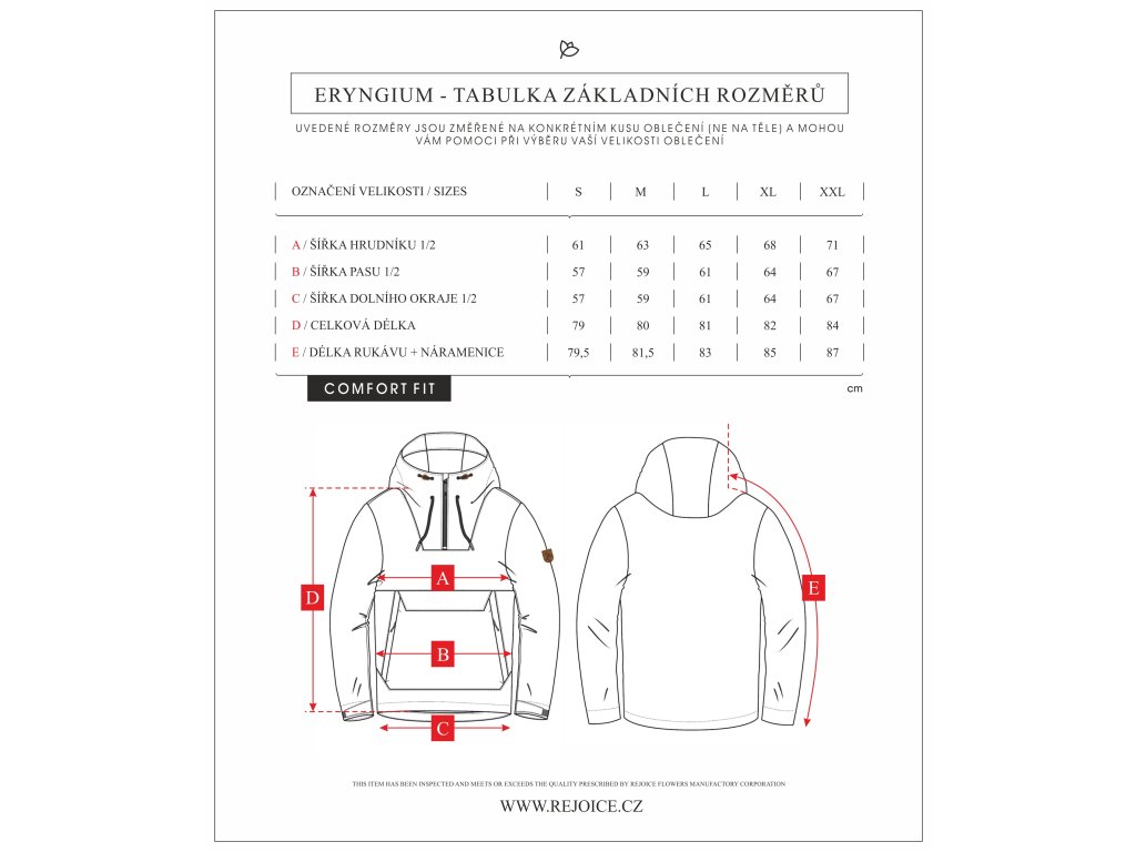 ERYNGYUM je promyšlený univerzální anorak vhodný do města i do přírody. Použit byl nepromokavý a prodyšný materiál vyvinutý pro maximální komfort v různorodých podmínkách. Vnější technická tkanina je laminovaná s voděodpudivou a prodyšnou membránou. Bunda je celopodšitá. Propracované střihové řešení, precizní zpracování a vyladěné detaily. Namísto klasických bund s rozepínáním na celé přední dílce nabízí anorak ERYNGIUM pohodlné rozepínání pod krkem a v levém bočním švu směrem nahoru což oceníte zejména při svlékání a oblékání, ale také jako prvek pro odvětrání přebytečného tepla. Samozřejmostí jsou extrémně odolné zipy s voděodputivou povrchovou úpravou. Extra pohodlná hlavní „klokaní“ kapsa důmyslně včleněna do předního dílu a je zapínaná na dva svislé zipy přístupné z boční strany. V hrudní části bundy je jedna menší kapsa s horním vstupem zapínaná na zip překrytý patkou. Rukávy jsou opatřeny velcrem a je tedy velmi snadné je dle potřeby stáhnout. Stahovatelná pomocí kulaté tkanice a kovových průchodek je také kapuce i dolní okraj bundy, ten je navíc v zadní části mírně prodloužen. Bunda je doplněna Rejoice etiketou z koženého recyklátu.