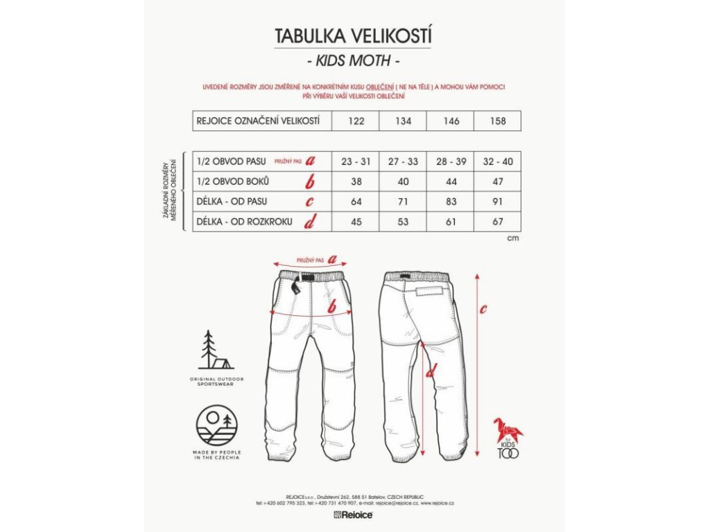 KIDS MOTH jsou lehké dětské plátěné kalhoty s jednoduchým pohodlným střihem. Na kolenou a sedací části zdvojená plátěná záplata. Na předním díle dvě hluboké kapsy a na zadním díle jedna kapsa s patkou na suchý zip. Nohavice ukončeny tunýlkem s pružnou kulatou gumou se samosvorkou. V pase pro větší pohodlí plochá guma a šňůra s plastovou samosvorkou na stahování. Na levém koleni vytkávaná etiketa - logo.Většina švů zdvojená.