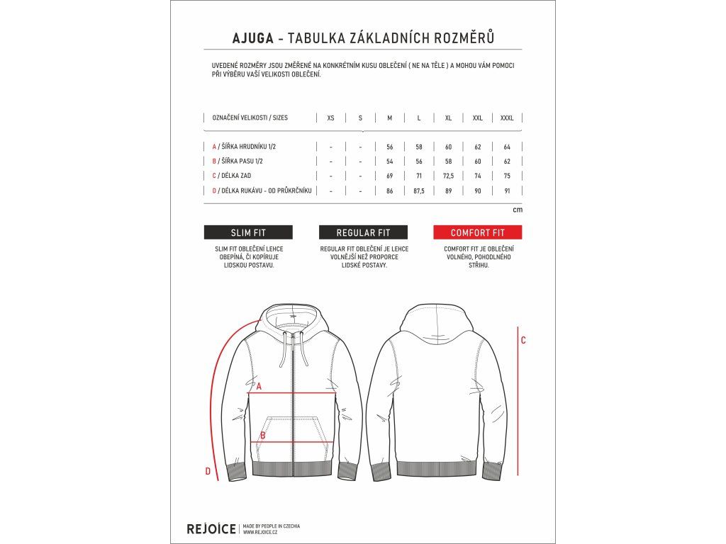 AJUGA je pánská celopropínací klokanka s pohodlným střihem. Směsový materiál s velkým podílem kvalitní bavlny. Kapuce je spojena stojákem. Průkrčník je pro větší pohodlí i pevnost začistěn barevným proužkem tónováným do barvy mikiny. Vnitřní strana kapuce je ušita ze základního materiálu. V kapuci je natažena plochá široká barevná tkanice. Jeden z jejích konců je zakončen vytkávanou etiketou. Kovové průchodky mají barvu starostříbro, stejně jako použité zdrhovadlo YKK. Zip je všit s částečným krytím. Vnitřní tkanice zipu je zapravena lemováním. Lemování kapsy je z hlavního materiálu. Náplet na ukončení rukávu i mikiny je z jemnějšího ribu s pružným elastanem, z lícové strany jsou náplety neprošité. Na rukávech je náplet vyšší než na těle. Kapsa, boční šev i průramky jsou z lícové strany ozdobně prošity silnější nití na overlocku. Nitě barevností navazují na klokanku. Mikina změkčena a vysrážena v REJOICE prádelně.